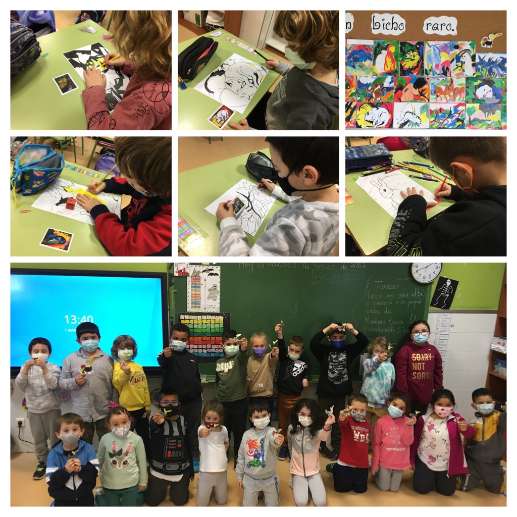 Así que tras un largo debate, votación y duras negociaciones... ¡Por fin teníamos cuento! En Primero A elegimos "Un bicho raro" y gracias a su historia, conocimos a Franz Marc, padre del expresionismo alemán. Una vez que conocíamos la historia, decidimos reescribir el cuento entre todos e ilustrarlo... Como os imaginaréis ya, las obras de Franz Marc sirvieron para ilustrar nuestra reinterpretación del cuento. Utilizamos para ello pinturas de madera, cera y rotulador para las partes del cuadro sobre las que queríamos captar la atención del que observa. Cuando la historia estuvo acabada, nos repartimos la lectura y la trabajamos en casa para después ponerle voz y montar todo en un vídeo. Como habréis podido comprobar, hemos tenido mucho trabajo, pero estamos muy orgullosos del resultado final, un buen trabajo en equipo donde cada uno ha aportado su granito de arena para reinterpretar este cuento tan divertido. Esperamos que os guste y lo disfrutéis casi tanto como nosotros.