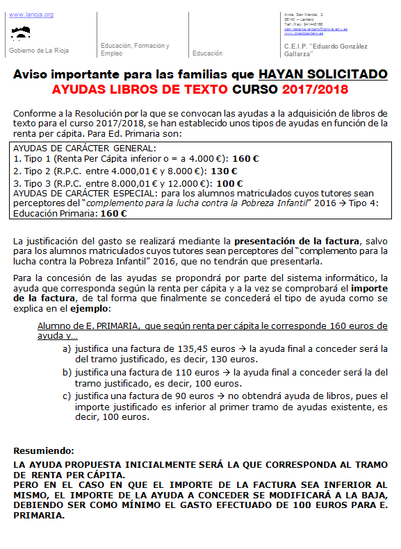 Noticias de la Secretaría Aviso importante para las familias que HAYAN SOLICITADO AYUDAS LIBROS DE TEXTO CURSO 2017/2018 Si habéis solicitado ayudas para los libros de texto del curso 2017/2018, debéis leer este aviso. Tags: Secretaría